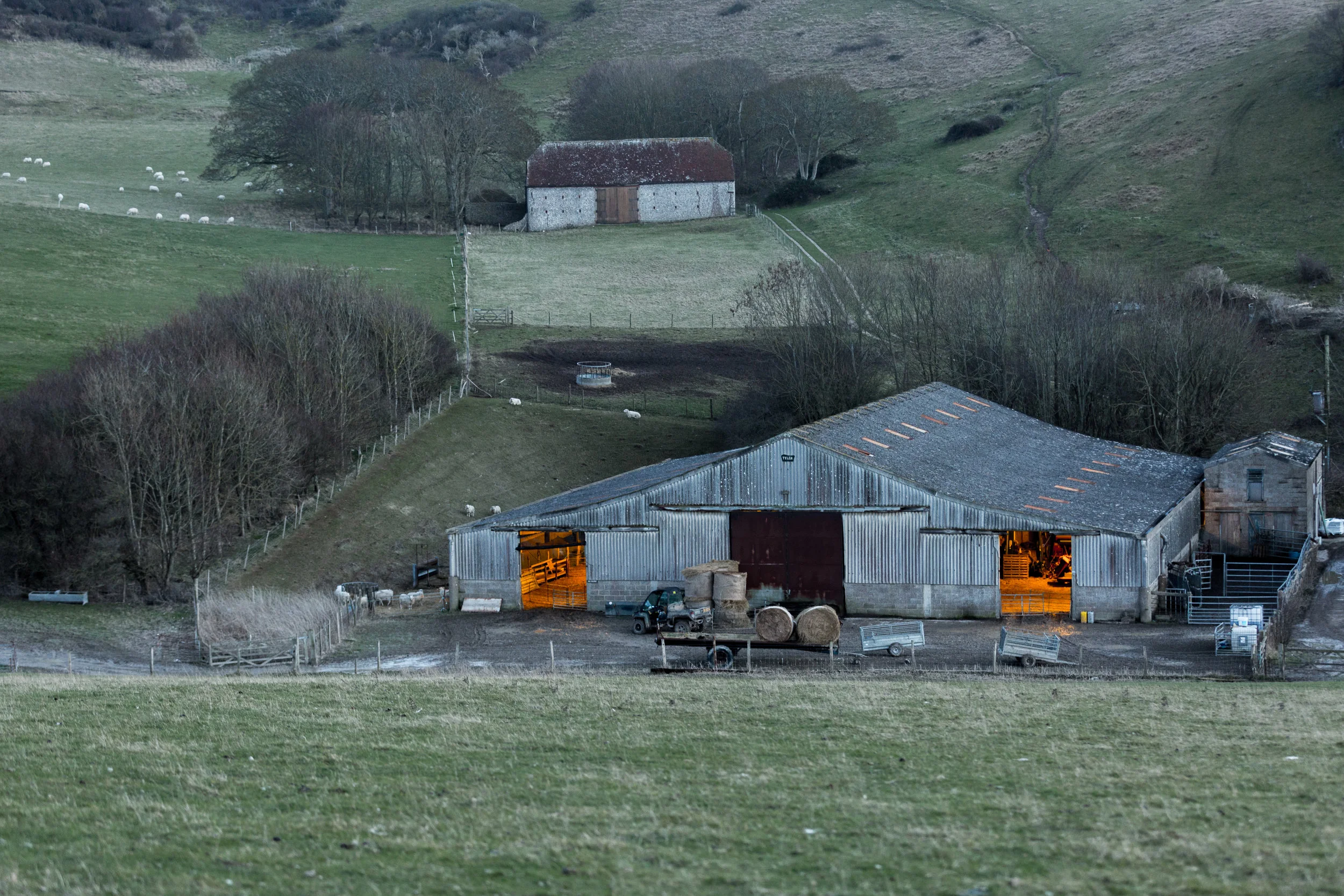 A jeep was herding a hundred sheep up a steep bank, that was a decent shot and then there was this cluster of buildings, a farmstead with lights glowing warmth and comfort.
